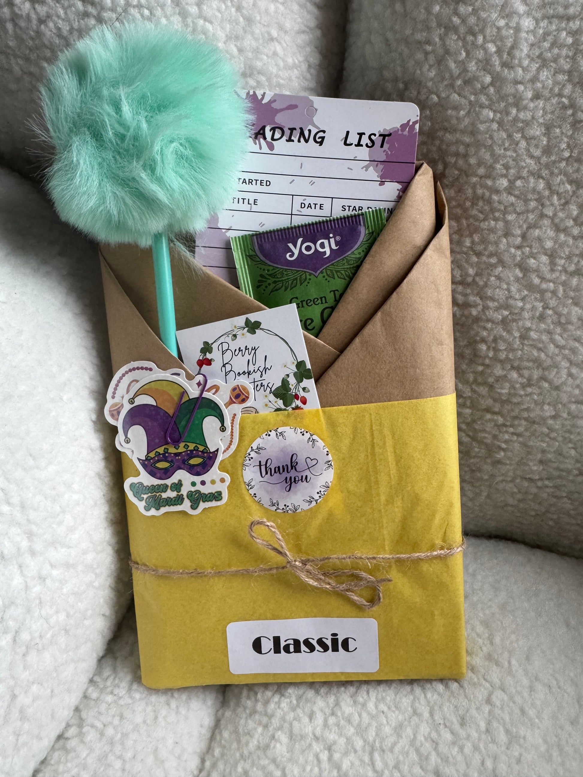 A beautiful hardcover Classic novel with a bookmark, tea, reading list bookmark, stickers, and a fluffy pen.